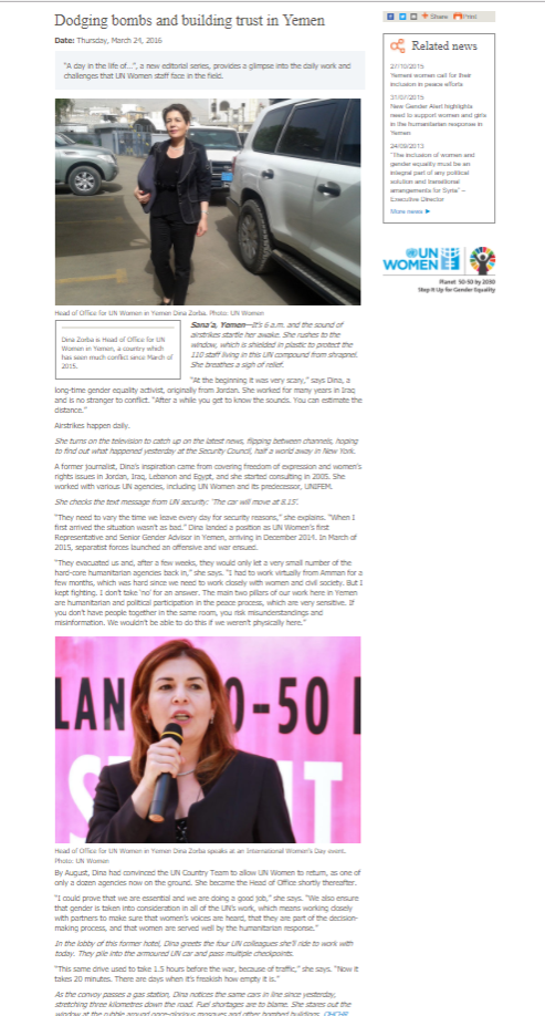 I developed several new story types and formats in my role as UN Women’s Global Web Editor. This included the “A day in the life of…” series. I interviewed Dina and wrote the inaugural story for this series on her role as Head of Office for UN Women in Yemen.